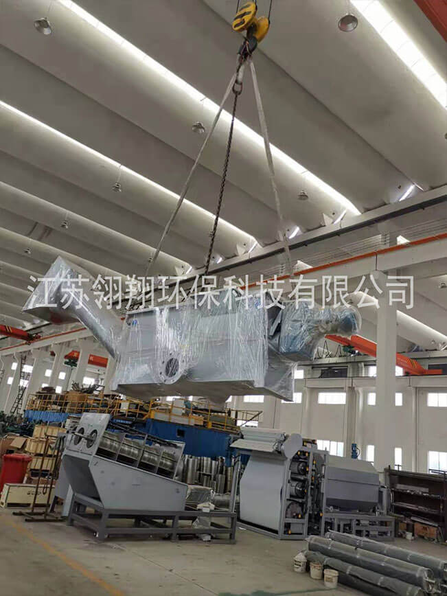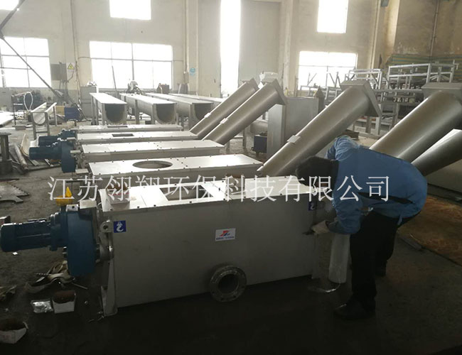 此裝置用于對格柵濾渣中的溶解物質(zhì)進行連續(xù)沖洗處理,然后進行脫水/壓榨處理之后運輸出去。進入裝置的格柵濾渣直接來自格柵機械(階梯格柵等類型的格柵),或通過其他濾渣運輸機械(輸送機等)。待處理的格柵濾渣直接投入螺旋壓榨機的料斗,螺旋壓榨螺旋桿開始啟動工作,將濾渣進行輸送壓榨脫水處理運行。與此同時,每隔一定時間螺旋壓榨機沖洗器向料斗和螺管內(nèi)注入沖洗水,對濾渣中有機物質(zhì)進行有效沖洗。沖洗水連同溶解物質(zhì)一起穿流螺管底部的篩網(wǎng),流入污水處理場的進水渠道。本裝置和階梯格柵機或轉(zhuǎn)格柵組合使用,將集過濾、壓榨一體化全閉運行。